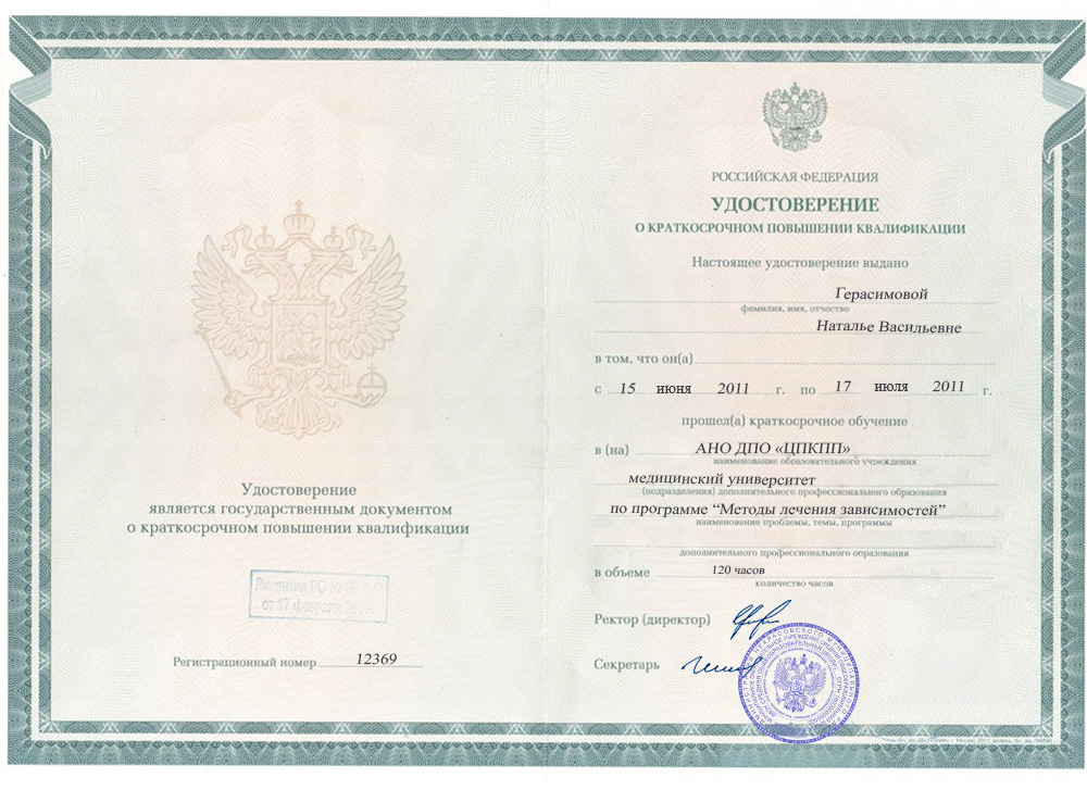 Наталья Васильевна Попова — высококвалифицированный специалист по наркологии с 15-летним опытом работы. Окончила Краснодарский государственный медицинский университет в 2005 году, получив диплом по специальности «Лечебное дело». В 2007 году прошла специализацию по наркологии, а в 2011 году получила удостоверение квалификации по психотерапевтическим методам лечения зависимостей.